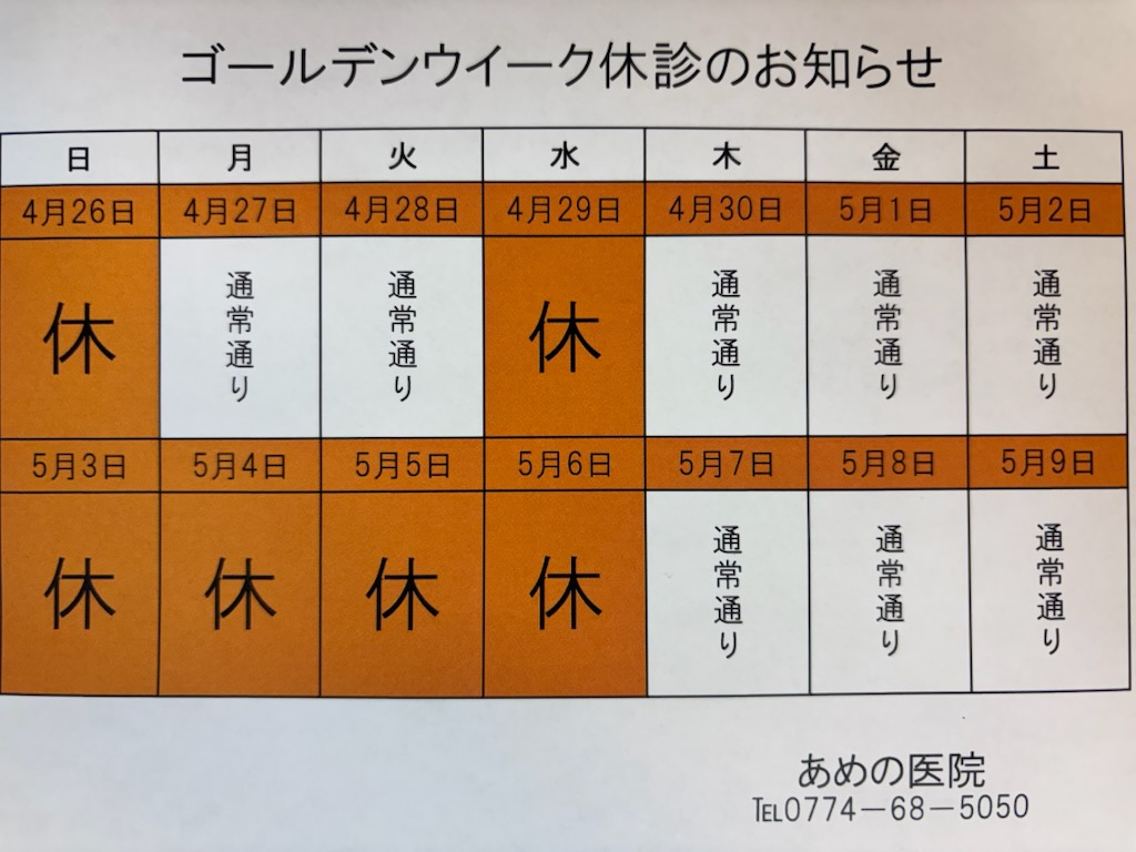 ゴールデンウィーク休診のお知らせ 2026 4/10 NEWS 5月ゴールデンウィーク休診のお知らせです。 カレンダー通りですので、お間違えないようにお気をつけください。 休診の前後は混みあうことが予想されますので 余裕をもってお越し頂きますよう宜しくお願い致します。 NEWS 令和8年度高齢者肺炎球菌ワクチン予防接種について